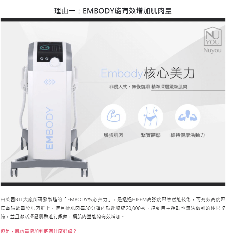 這一年多來,市面上增肌儀器突然像雨後春筍般推出,每台儀器都強調自己的獨特性及效果,然而在眾多選項當中,甯寓美學卻選擇了「EMBODY核心美力」這台增肌儀器,現在就用這篇帶大家一起了解到底它有什麼優勢,而為什麼鄭黃中宇醫師萬中選一,選擇了它呢?