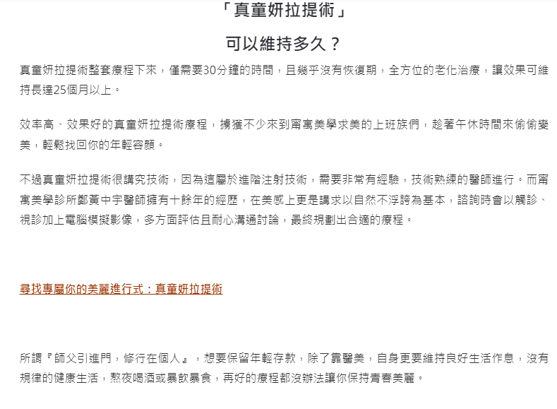 時間對我們是磨練也是殘酷,尤其是女人,掌握了未來道路、豐富了內在素質,同時也流失了膠原蛋白。隨著年齡增大,皮膚逐漸鬆垮下垂、出現皺紋,那令人痛恨的老態撲面而來,該怎麼辦呢? 除了以往大家熟知的鳳凰電波、音波拉皮、玻尿酸、舒顏萃,讓甯寓美學診所的鄭黃中宇醫師在報你知一項結合舒顏萃及玻尿酸的複合式治療新選擇:『真童妍拉提術』!