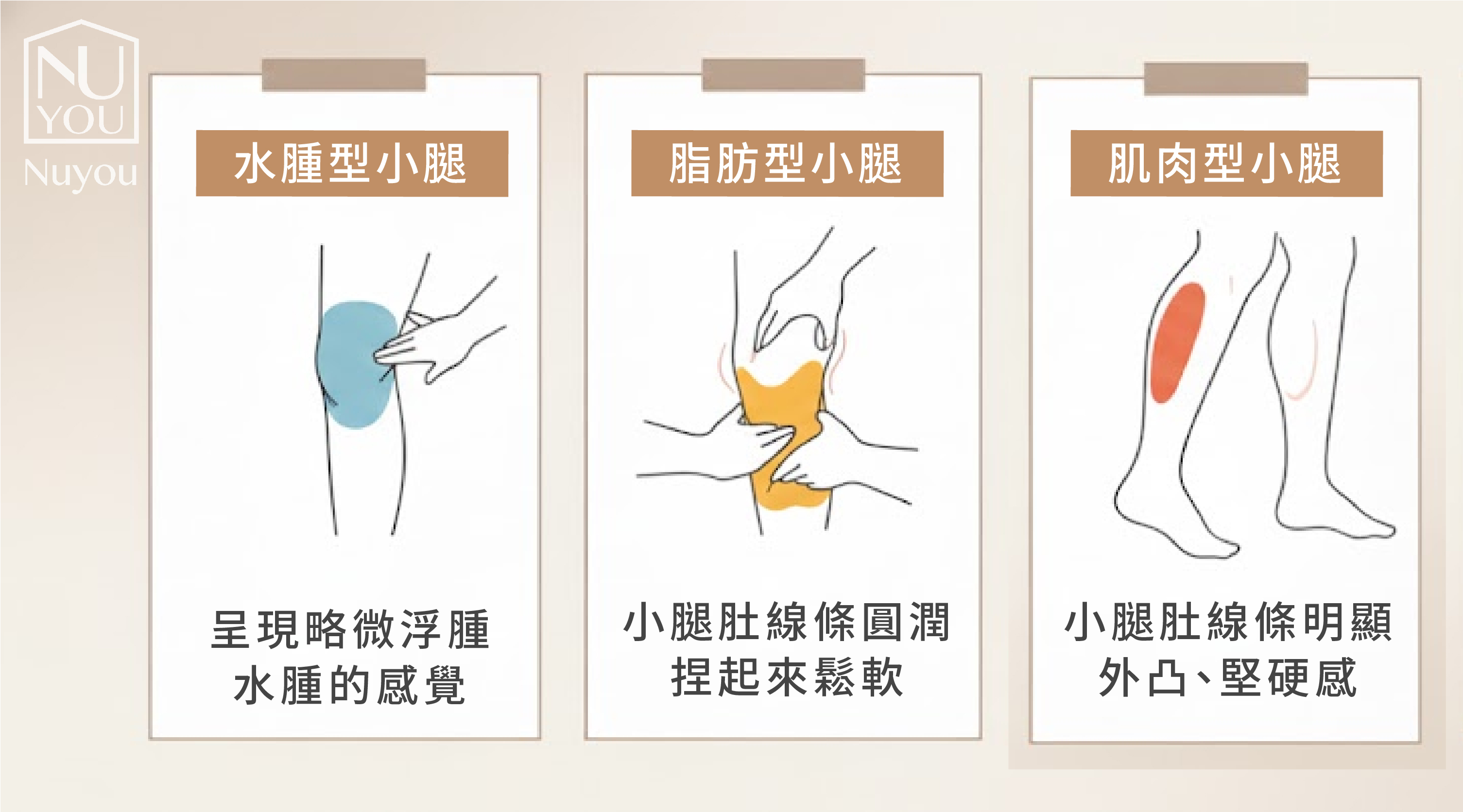 - 水腫型 早晚小腿粗細差異大,按壓皮膚會有凹陷。 不適合肉毒、需改善生活習慣或搭配排水。