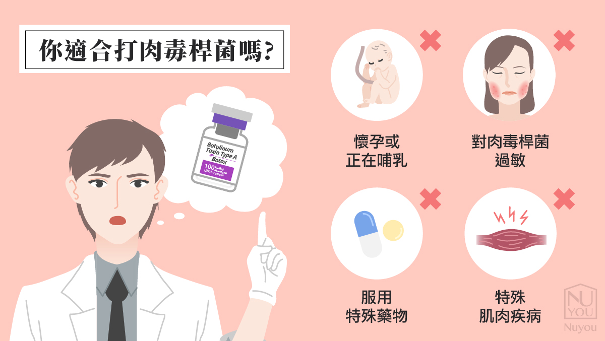 雖然肉毒桿菌安全性高,但仍有以下情況需避免施打,請務必在術前誠實告知醫師: