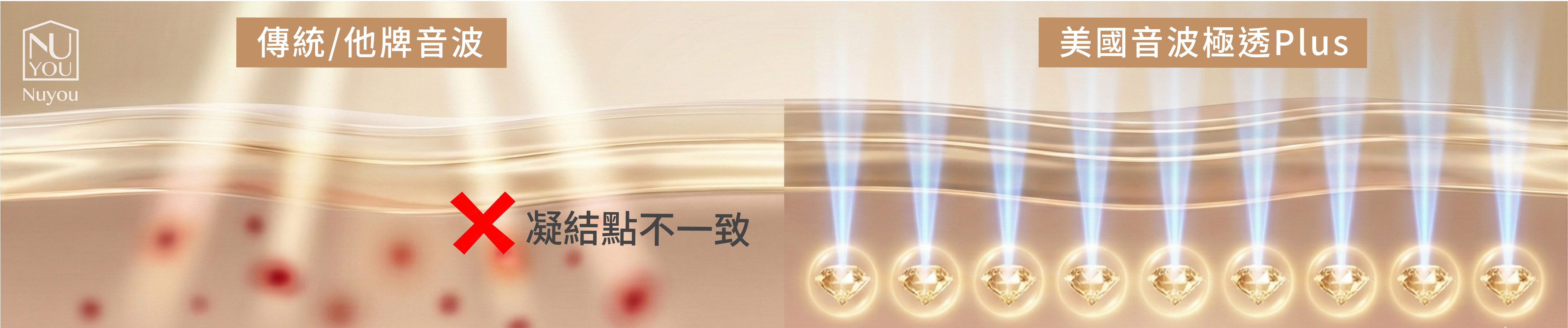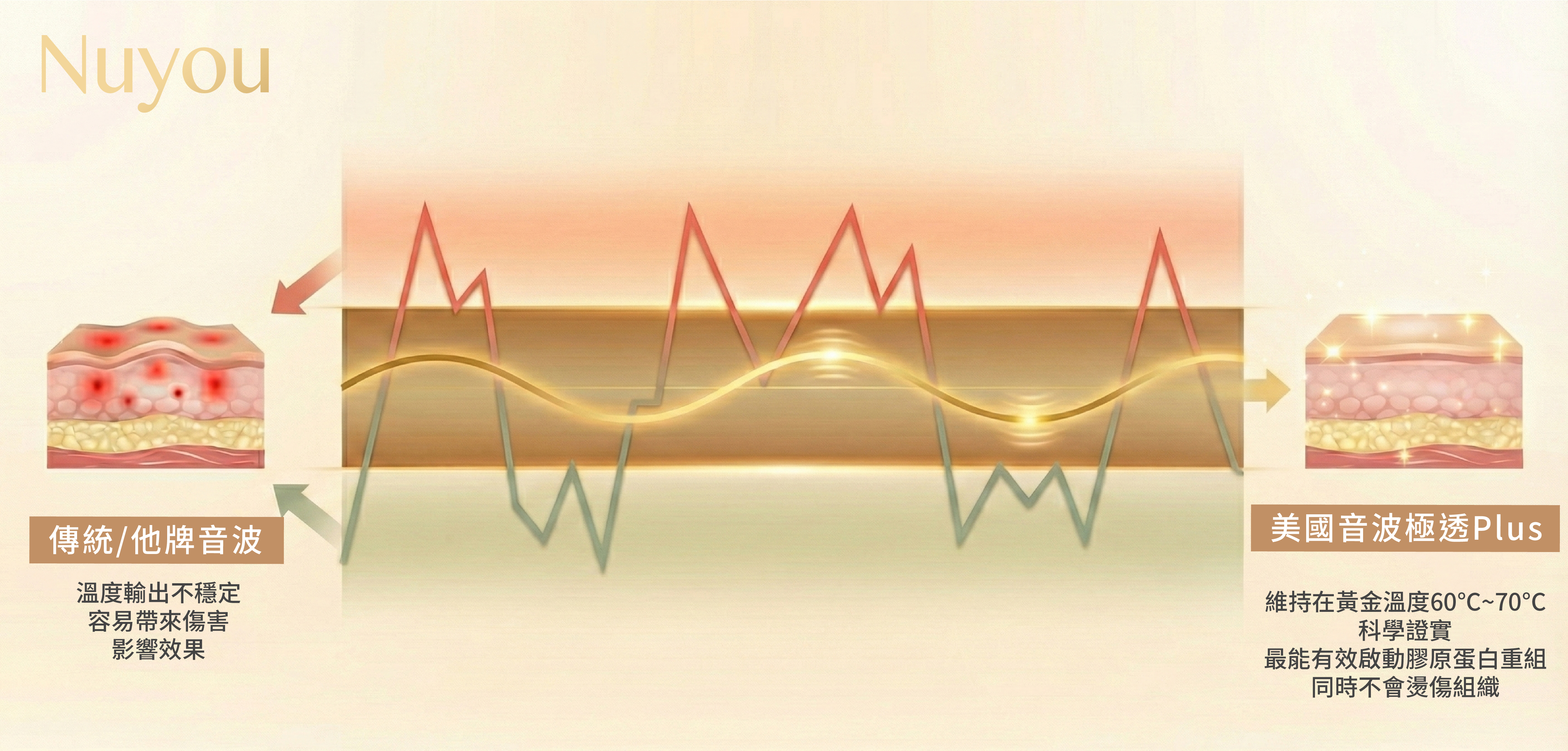 音波拉提的緊緻效果,來自於能量在深層形成的「熱凝結點」。許多非原廠或傳統音波儀器,可能因能量輸出不穩定,導致熱點不夠集中、溫度忽高忽低,影響膠原蛋白新生的效果,甚至可能因過熱造成風險。